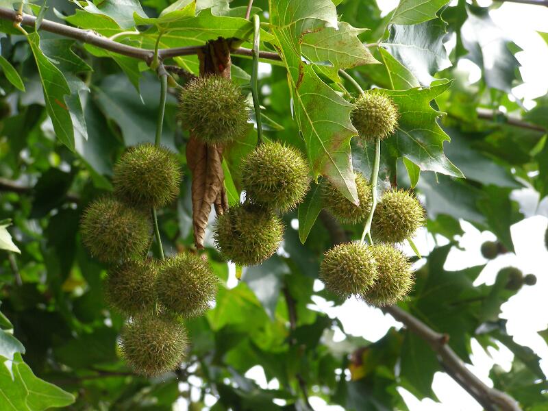 Eigenschaften: Die Bergahorn ist ein wunderschöner hoher Baum, der sich für große Gärten oder Parks eignet. Es hat glänzende, sehr große (20-22 cm breite) Blätter, die an Ahornblätter erinnern und eine hellgrüne Farbe haben. Im Herbst verfärben sie sich gelb und braun. Nach dem Laubfall lockt es mit seiner abblätternden Rinde. Es ist hellgrau und hinterlässt dort, wo es sich ablöst, braune, graue und grüne Flecken, was besonders im Winter sehr dekorativ ist. Er blüht im Mai mit kleinen grünlichen Blüten, die später zu stacheligen Kugeln heranreifen, die den ganzen Winter über am Baum bleiben. Die Bergahorn dominiert die Bepflanzung der Londoner Straßen, weshalb sie auch Londoner Platane genannt wird.
