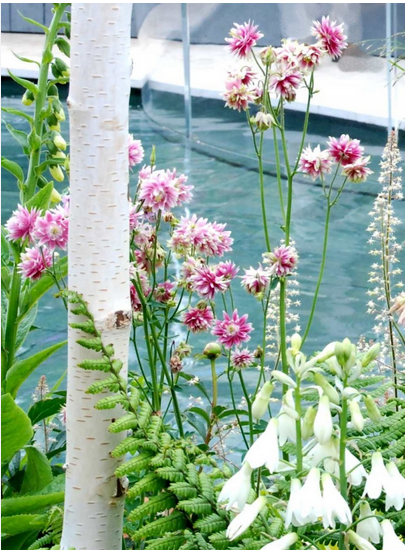 Zweifarbiger vollblühender Akelei mit rosa und weißen Blüten von ungewöhnlichem Aussehen.
