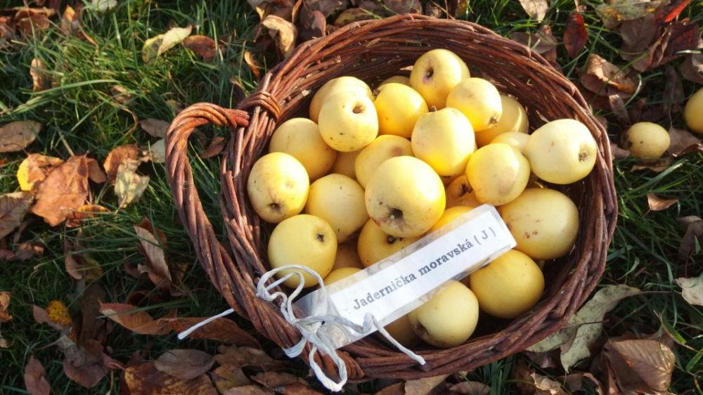 Eigenschaften:Der Apfelbaum ´JADERNIÈKA MORAVSKÁ´ wurde als zufälliger Setzling in der Tschechoslowakei gezüchtet. Sie ist in der Walachei und im Osten Mährens weit verbreitet. Er wird auch Weinapfel, Jadernica und Vinary genannt. Die Früchte sind klein bis mittelgroß (Durchschnittsgewicht 100 g) und konisch geformt. Die Haut ist glänzend, gelb, mit einer sanften roten Wange. Das Fruchtfleisch ist weiß, saftig, zart, mit süßem Geschmack und einer milden würzigen Note. Äpfel werden an der Wende September/Oktober geerntet, sind im November reif für den Verzehr und können bis März gelagert werden. Die Sorte eignet sich zum Direktverzehr, zum Trocknen und vor allem zur Herstellung von Apfelwein und Spirituosen. Es ist sehr frostbeständig und eignet sich daher auch für den Anbau in höheren Lagen.