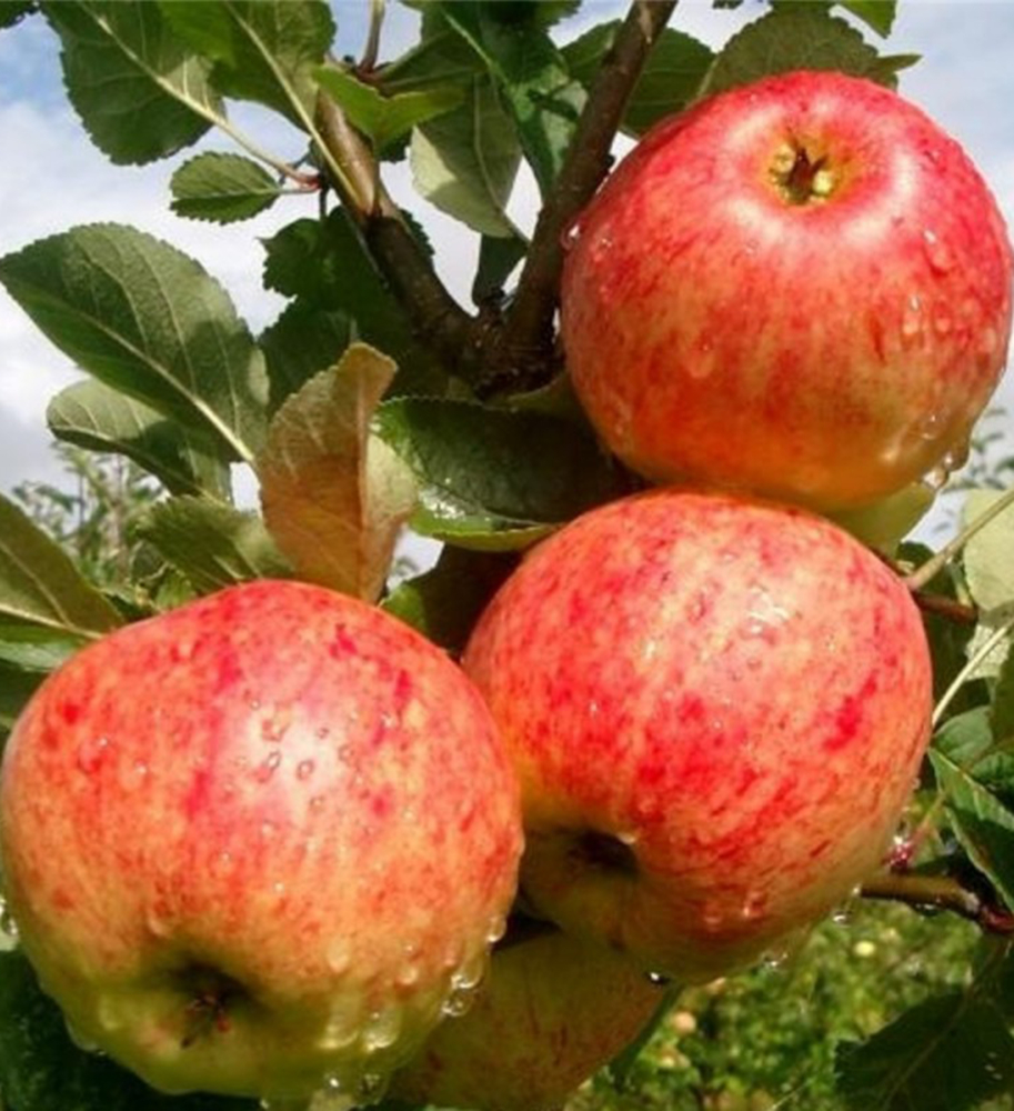 Eigenschaften: Es hat mittelgroße bis große Früchte mit einer ausgeprägten roten Oberfläche. Das Fruchtfleisch ist gelb-weiß, weich, aromatisch, saftig und hat einen süßen Geschmack. Er reift Ende August und ist bis Mitte Oktober lagerfähig. Es handelt sich um eine sehr frostbeständige Sorte, resistent gegen Mehltau und mäßig resistent gegen Schorf und Moniliose. Der Apfelbaum „James Grieve Red“ ist eine der besten Sommersorten mit regelmäßiger und reichlicher Fruchtbarkeit, er trägt auch Früchte am einjährigen Holz. Anbau:Vor dem Pflanzen kürzen wir das Wurzelsystem um maximal 1/3 seiner Länge, Wir schneiden auch mechanisch beschädigte, abgebrochene oder verbogene Wurzeln. Wir kürzen die zarten, nährenden Wurzeln nicht. In der Regel graben wir eine 1,5-2 mal größere Grube. Am Boden der Grube empfiehlt es sich, dem Boden Gartensubstrat und bei der Frühjahrspflanzung organischen Dünger.