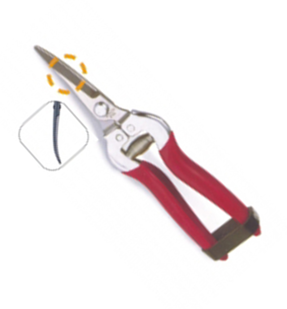 Gartenschere mit gebogener Klinge, hauptsächlich für die Weinlese geeignet.