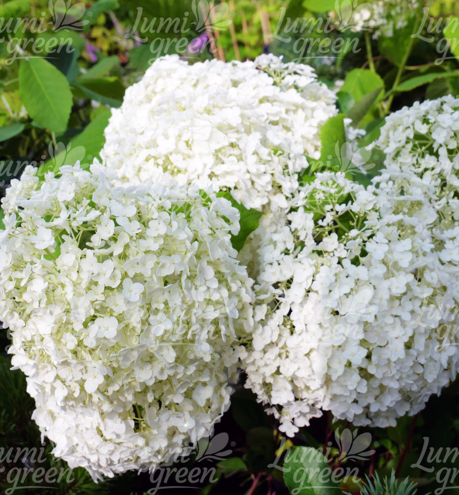 Eigenschaften: Die Ballhortensie ’ANNABELLE’ wächst als dicht verzweigter Strauch und erreicht eine Höhe von etwa 1,5 m. Ab Mitte des Sommers erscheinen große, bis zu 18 cm breite, kugelförmige Blütenstände, die zunächst zartgrün sind und sich später in ein strahlendes Schneeweiß verwandeln. Die Blätter sind mittel- bis dunkelgrün und eher matt.