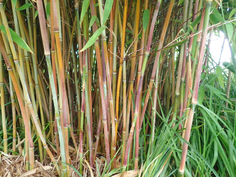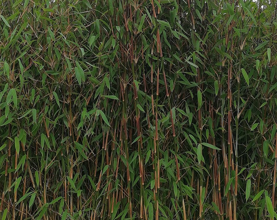 Immergrüner Bambus "Winterfreude" mit ganzjährig rotgrün gefärbten Halmen.