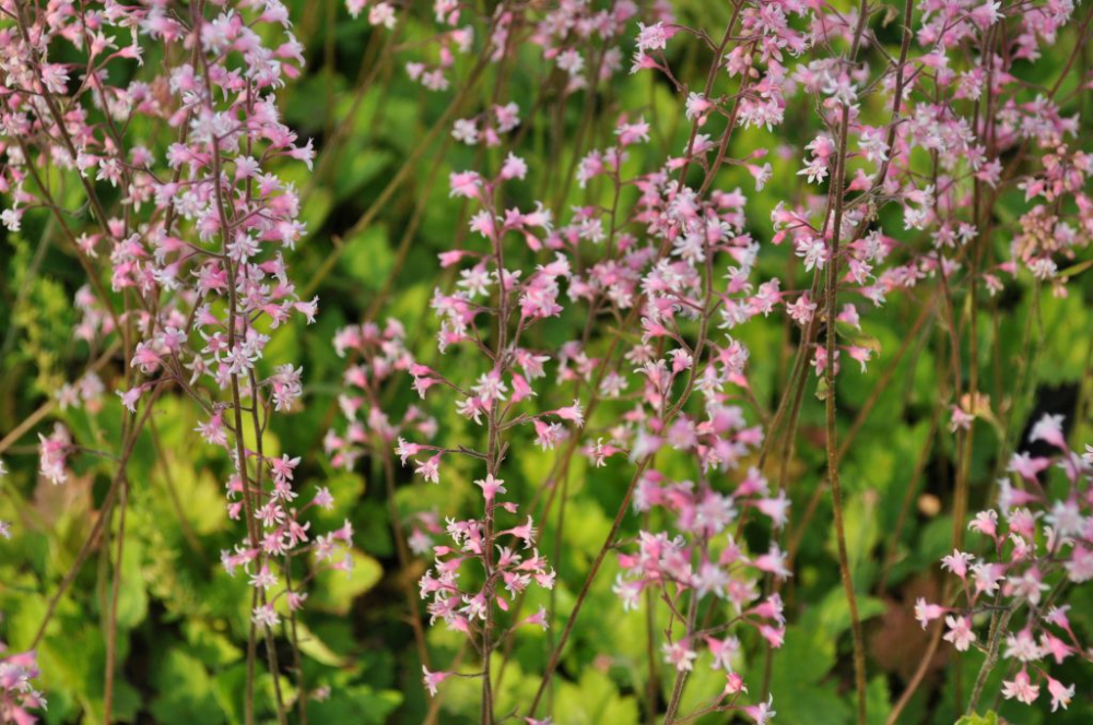 Eigenschaften: Bastardschaumblüte 'BRIDGET BLOOM' ist eine neue Sorte, die einen kompakten Haufen frischgrüner Blätter ohne nennenswerte kontrastierende Blattadern bildet. Das macht es attraktiv und einzigartig. Sie wird 25–30 cm hoch. Oberhalb der Blattebene bilden sich in den Sommermonaten zarte, blassrosa Blüten in Form kleiner sternförmiger Glöckchen. Sie wird gerne in Gärten gepflanzt, vor allem wegen ihrer wunderschönen farbigen Blätter, die äußerst dekorativ sind und unter unseren Bedingungen bei den meisten Arten auch im Winter bestehen bleiben. Sie lässt sich gut mit anderen Sorten mit farbigen Blättern kombinieren und bildet mit ihnen ein buntes Mosaik. Sie gedeiht auch in Töpfen auf Balkon und Terrasse.