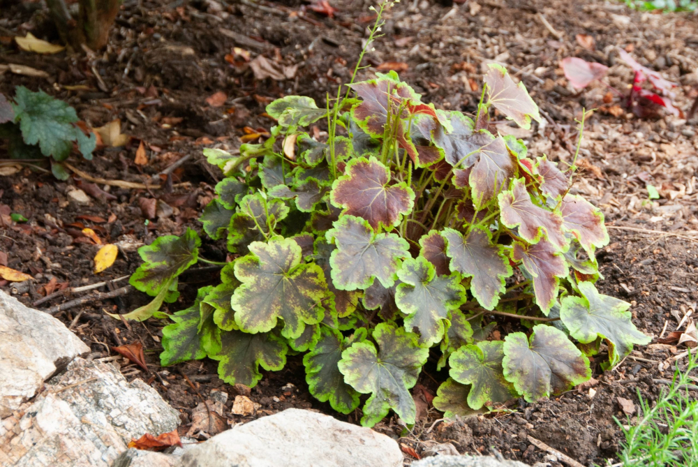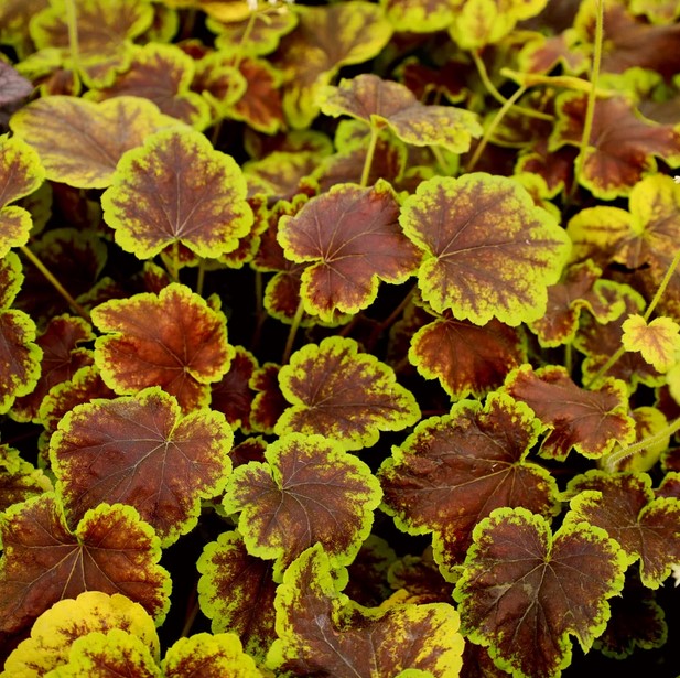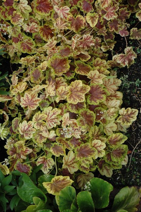 Eine kompakte Staude mit schön geformten, kastanienfarbenen Blättern mit gelbgrünem Rand.