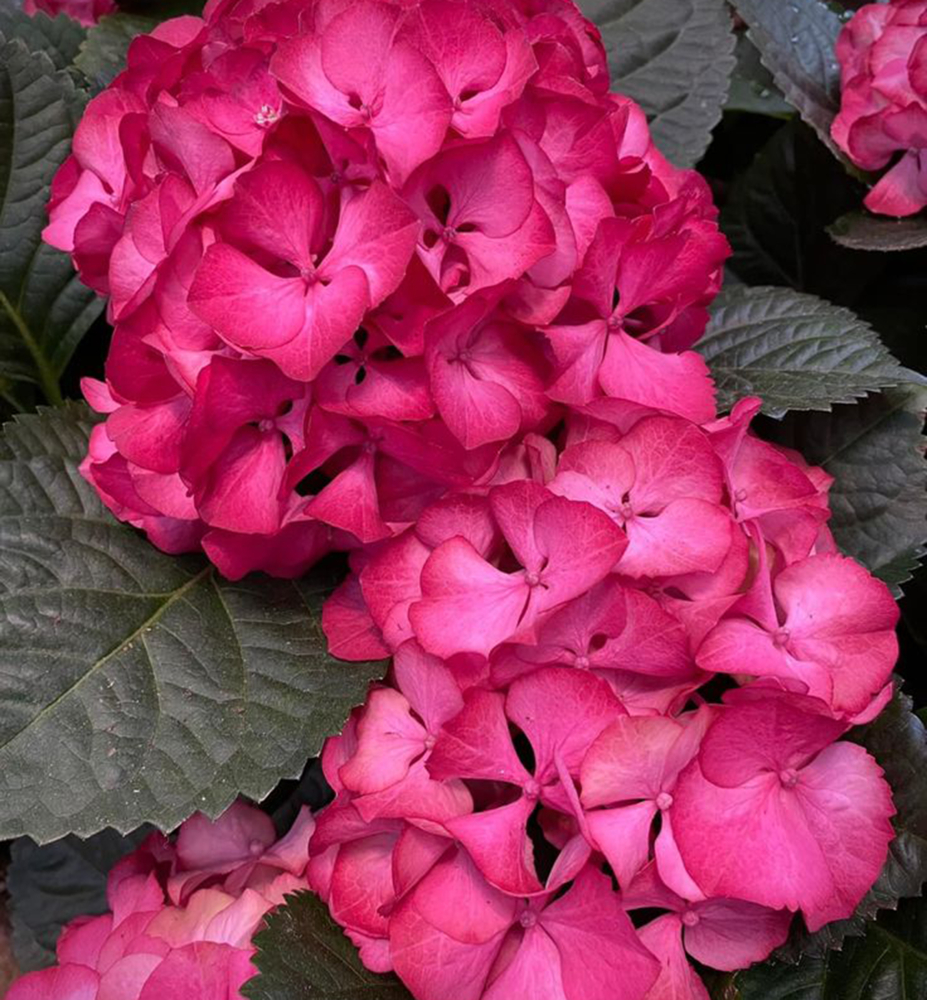 Eigenschaften: Die Bauern-Hortensie 'BALADIA HOT PINK' zeichnet sich durch tiefrosa Blüten aus, die halbkugelförmige Blütenstände bilden. Die ovalen bis breit eiförmigen Blätter können sich im Herbst gelbbraun oder rötlich verfärben. Sie wächst als dicht belaubter Strauch und erreicht eine Höhe von 1–1,5 m. Sowohl im Staudenbeet als auch im Kübel auf Balkon und Terrasse kommt sie hervorragend zur Geltung.