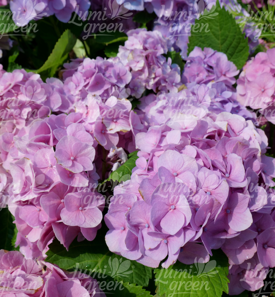 Eine neue, dicht belaubte Hortensie mit leuchtend rosafarbenen Blüten.