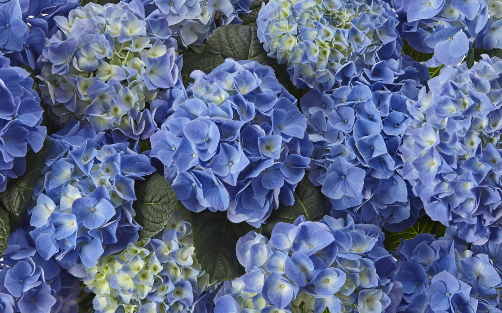 Unwiderstehliche Hortensie mit großen, azurblauen Blütenständen.