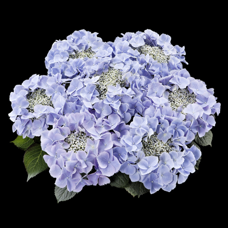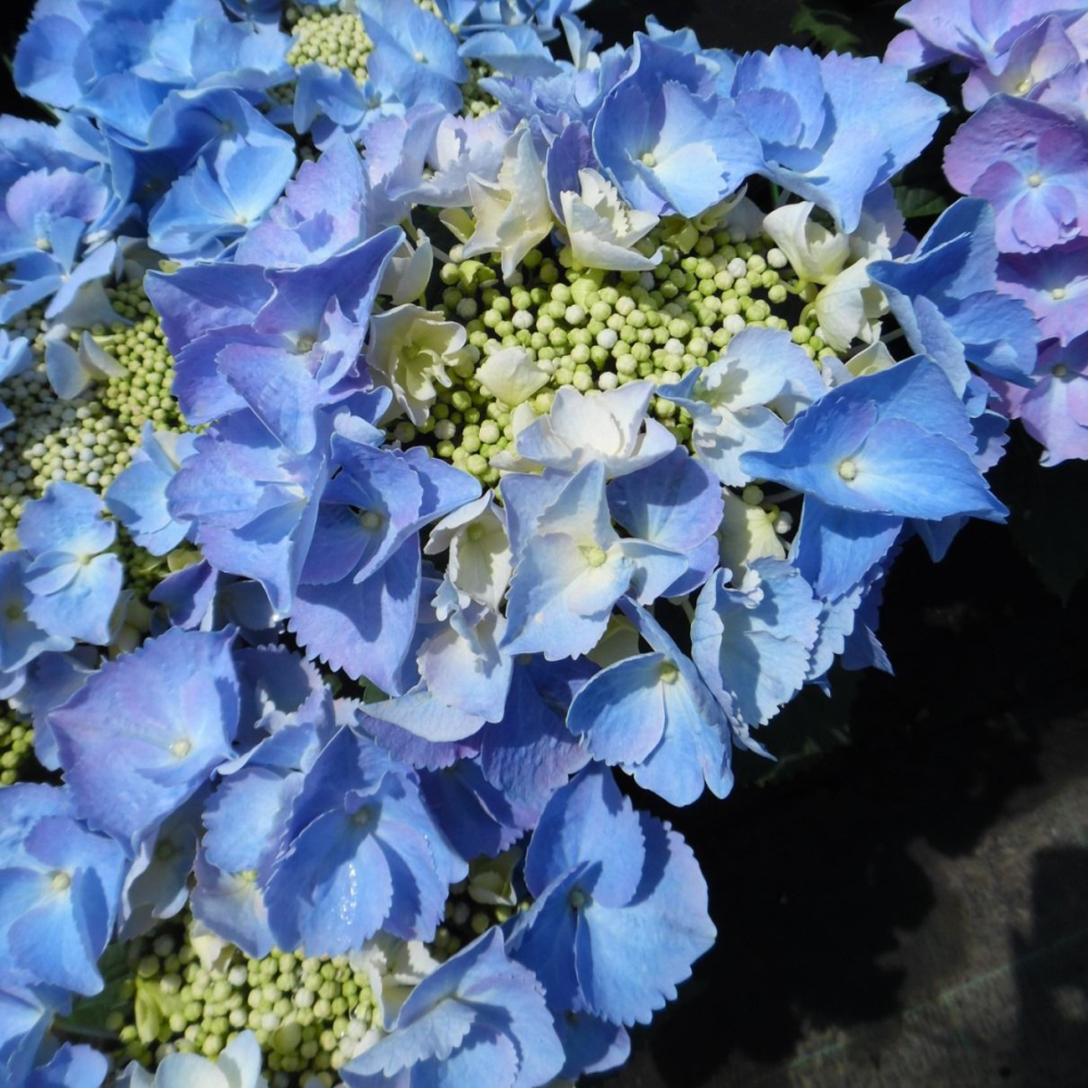 Neue, reich blühende Hortensie mit großen Blütenständen aus blauen Blüten.