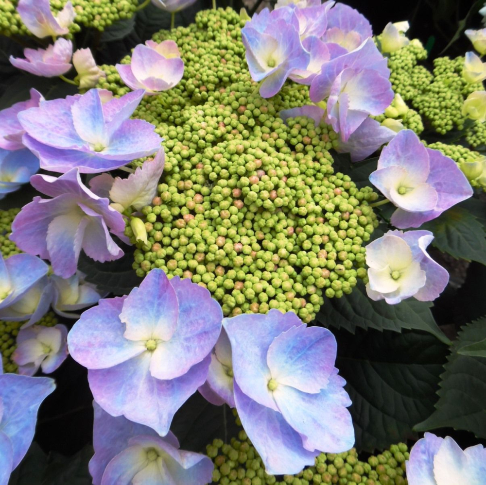Eigenschaften: Die Bauern-Hortensie ´FRISBEE® BLUE‘ ist ein kompakter, reich blühender Strauch mit aufrechten, kräftigen Trieben. Die Blütenstände sind flach und bestehen aus zahlreichen kleinen Blüten in Blau bis Blauviolett. Je nach Säuregehalt des Bodens kann sich die Blütenfarbe verändern. Die Blätter sind tiefgrün und stark gezähnt am Rand. Die Sorte eignet sich hervorragend als Hecke oder als Solitärpflanze. Sie erreicht eine Höhe von 1–1,5 m und eine Breite von etwa 1,5–2 m.