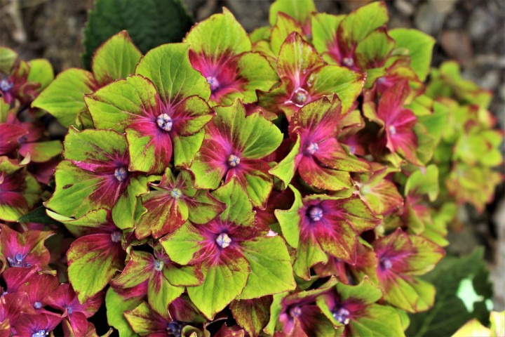 Einzigartige Hortensie mit lila-roten Blüten und kontrastierenden grünen Blatträndern.
