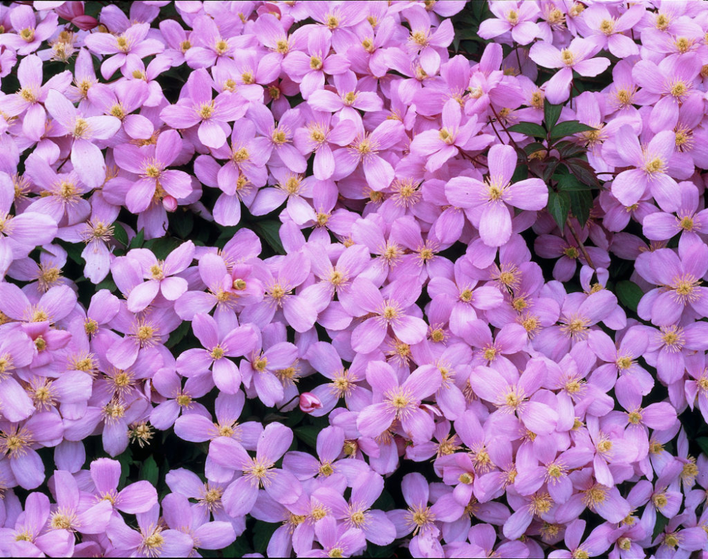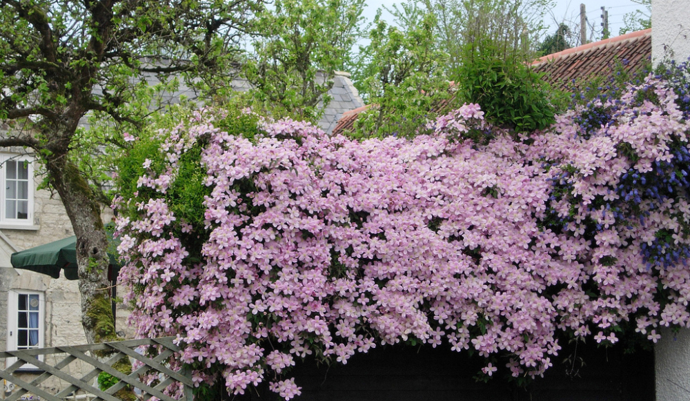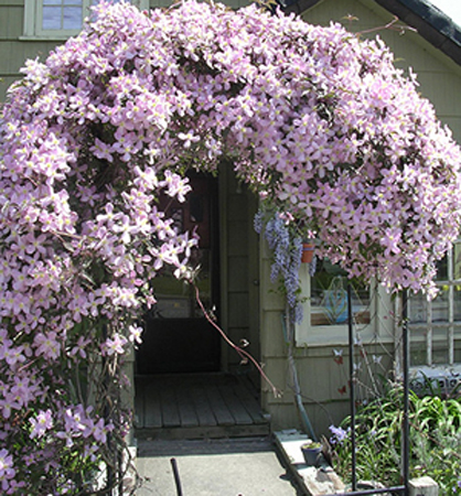 Schnell wachsende, duftende, blassrosa Clematis, die nicht geschnitten werden muss.