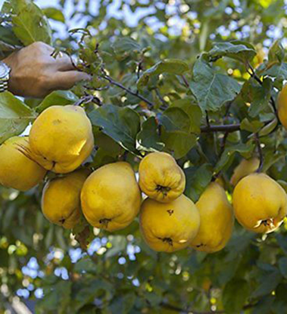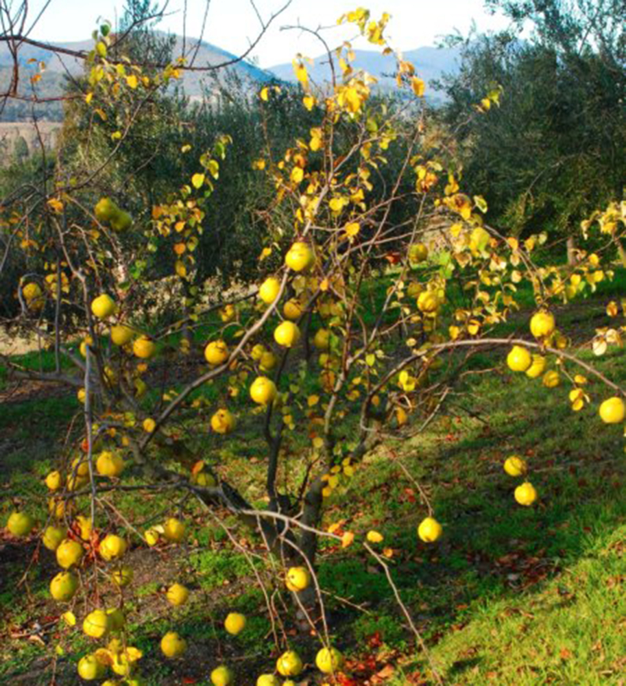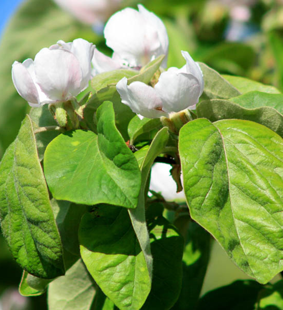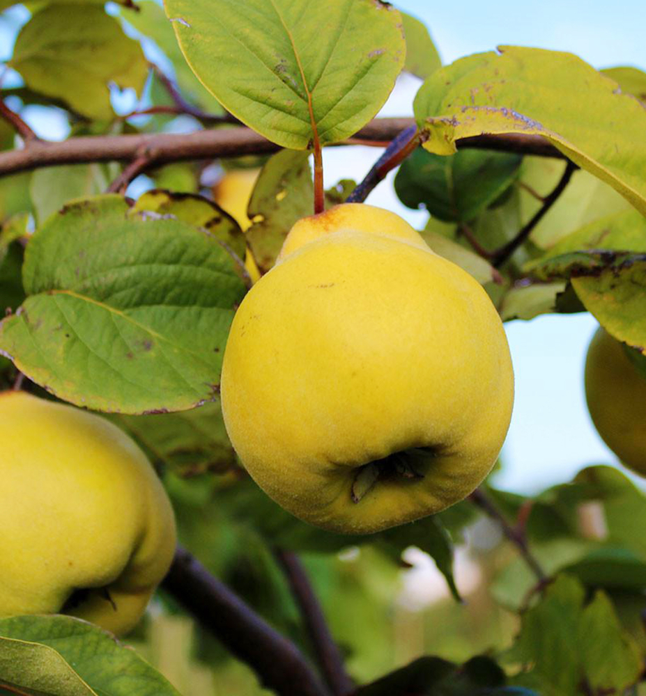 Eigenschaften: Dula stammt aus den warmen Regionen Südwestasiens. Die Sorte „VRANJA“ bringt große gelbgrüne, birnenförmige Früchte mit ausgeprägtem Aroma hervor. Er wächst als reich verzweigter Strauch, der eine maximale Höhe von 5 m erreicht. Als Solitär eignet sie sich für Ziergärten. Die Blätter haben eine dunkelgrüne Farbe und sind auf der Unterseite filzig. Sie blüht von April bis Mai mit weißen Blüten. Quitten sind eine ausgezeichnete Quelle für Vitamin C. Sie können zur Herstellung von Marmeladen, Gelees und Quittenpudding verwendet werden, oder sie können geschält und anschließend geröstet, gebacken oder gekocht werden. Ihr starkes Aroma prädestiniert sie für die Zugabe zu Apfelkuchen und Marmelade, um deren Geschmack zu verstärken.