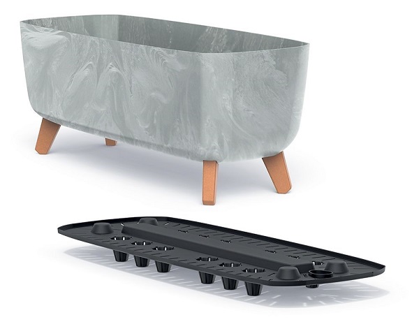 Eigenschaften: Der Blumentopf Gracia ist ein eleganter und praktischer Pflanztopf, der sich durch seine moderne Betonoptik und seine leichte, auf Füßen stehende Form auszeichnet. Anstelle von Blähton verfügt er über eine perforierte Drainageschicht, die für den Abfluss von überschüssigem Wasser sorgt und die Wurzeln von der unteren, feuchten Substratschicht trennt. Länge: 39 cm, Breite: 19,5 cm, Höhe: 18,7 cm.