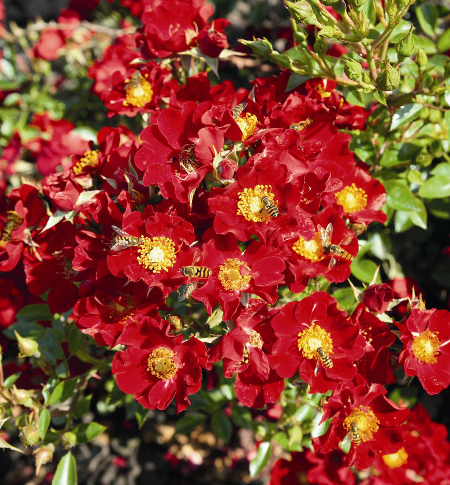 Eine unverwechselbare Rose mit halbgefüllten, intensiv roten Blüten, die Bienen anziehen.