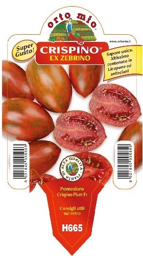 Eigenschaften: Die Tomatensorte ´CRISPINO PLUM F1´ ist eine frühe, interessante Sorte mit reichtragenden, schmackhaften Früchten und dunkelrotem Fruchtfleisch. Die Pflanze bildet einzelne oder doppelte Rispen mit 6–10 ovalen Früchten, rot mit seltener grüner Marmorierung. Das Fruchtfleisch ist süß, aromatisch und von ausgezeichneter Qualität. Die Sorte ist resistent gegen gängige Krankheiten.