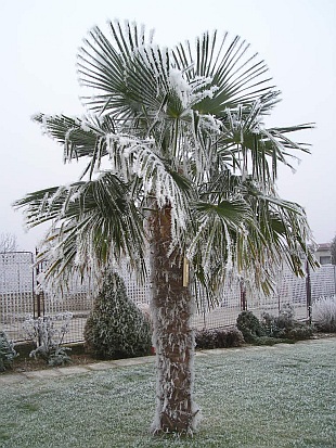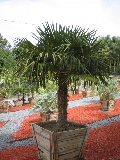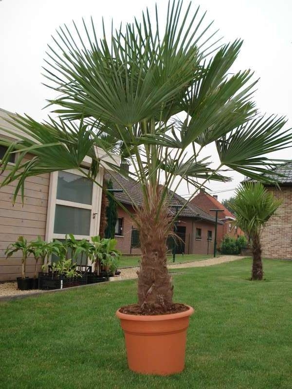 Eigenschaften: Trachycarpus Fortunei wächst in Nordindien, Nepal und Nordchina. Charakteristisch sind fächerförmige Blätter von hellgrüner bis dunkelgrüner Farbe, die im ausgewachsenen Zustand eine Länge von 140 bis 190 cm erreichen. Die Blätter wachsen symmetrisch und bilden eine 2,5-3 m breite Krone. Der Stamm ist schlank, verbreitert sich nach oben und ist mit einem dichten Gewirr feiner brauner Fasern bedeckt, weshalb er Hanfpalme genannt wird. Diese Palmen erreichen eine Höhe von 6-12 m, frei im Garten wachsend sind sie kleiner. Sie blüht von Mai bis Juni mit interessanten gelben Blütenständen.