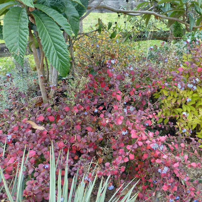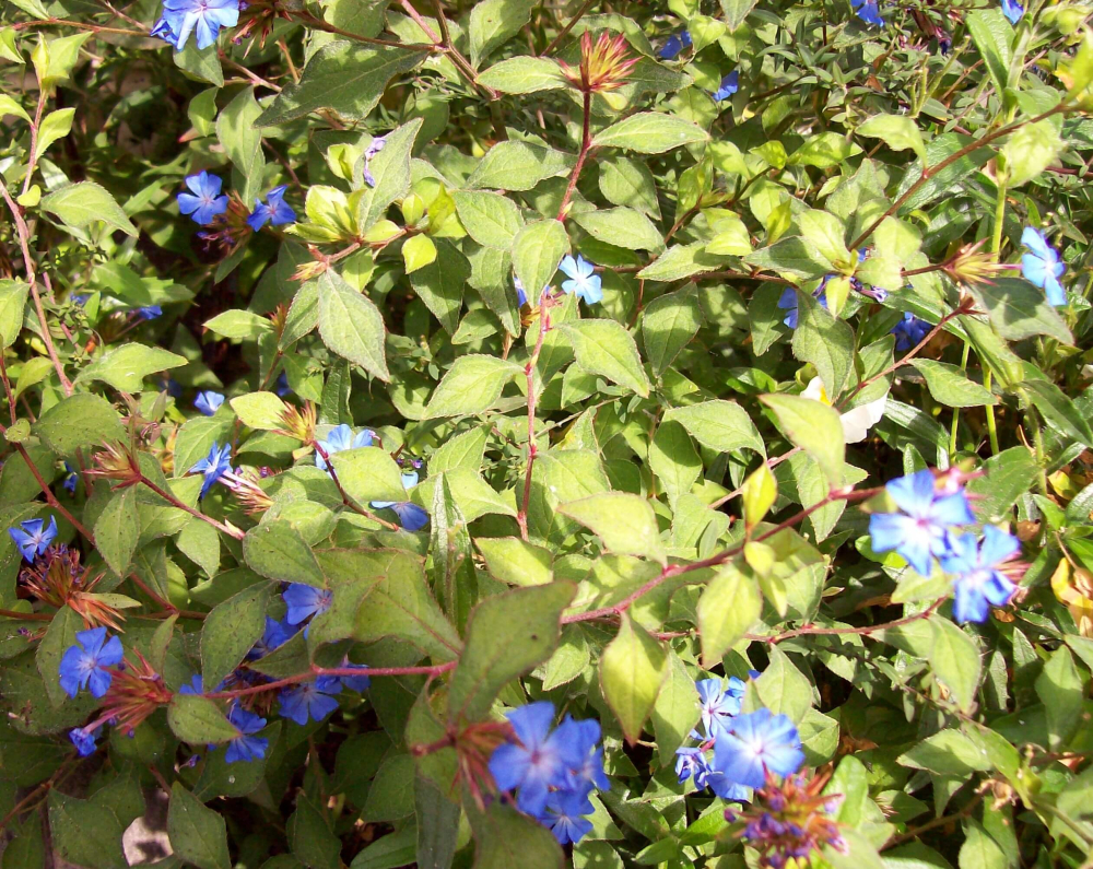 Eigenschaften: Die Chinesischer Bleiwurz bildet einen ausladenden, laubabwerfenden Strauch mit kleinen blauen Blüten, die von Ende August bis in den Herbst blühen. Die fünfblättrige Blüte ist etwa 1–2 cm breit und wächst in kleineren Büscheln an den Enden burgunderroter Zweige. Die Laubblätter sind fein behaart, rund bis eiförmig, mittelgrün mit burgunderrotem Rand und verfärben sich im Herbst schnell rot, während der Strauch weiter blüht. Der Strauch ist dicht, etwas ungepflegt, mit hängenden Seitenästen und aufragenden Mittelästen. Je mehr Sonne er bekommt, desto mehr Blüten trägt er. Er ist frostbeständig bis ca. -24 °C.