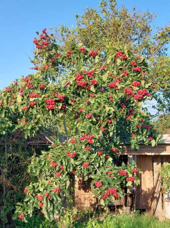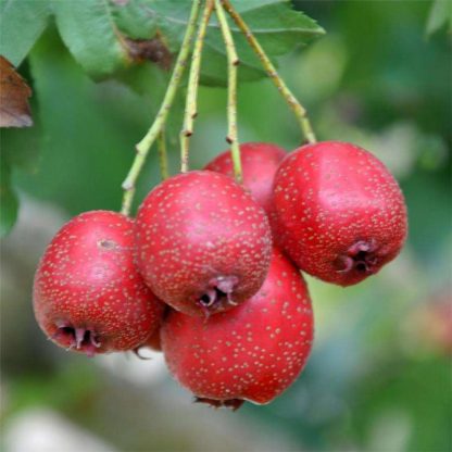 Großfrüchtiger Weißdorn mit heilsamen, kugeligen roten Früchten mit süß-saurem Geschmack.