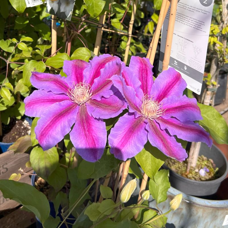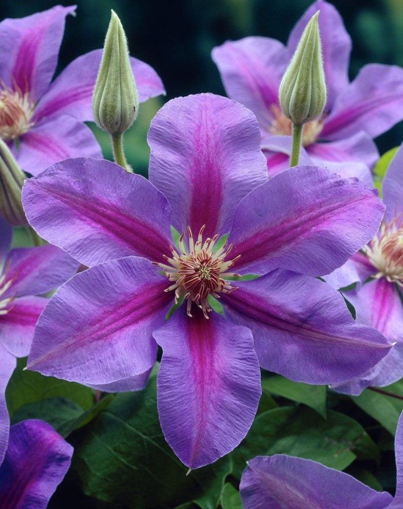 Eine attraktive Clematis-Sorte mit violetten Blüten und auffälligem rosaroten Mittelstreifen.