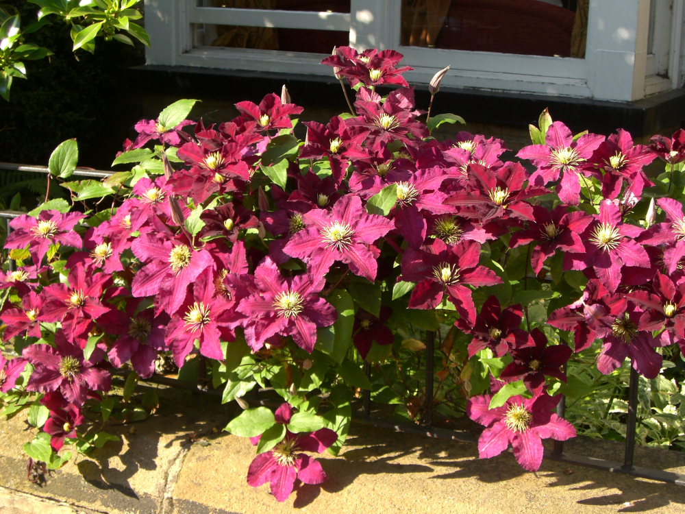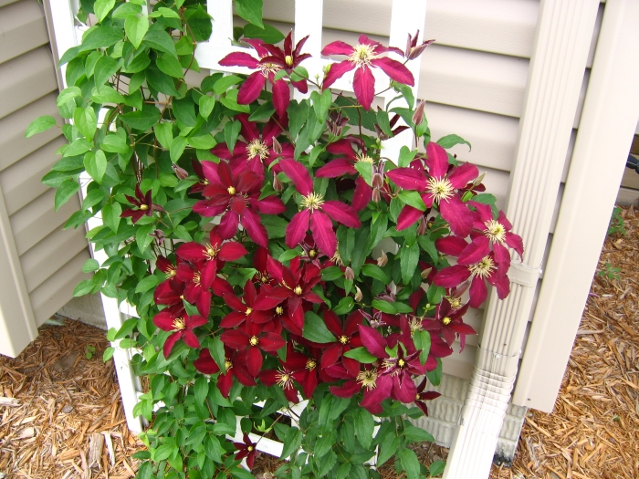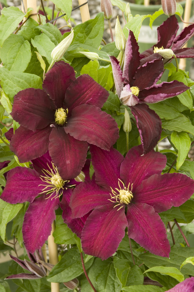 Eine remontierende, großblumige Clematis mit dunkelroten Blüten, die in zwei Wellen blüht.