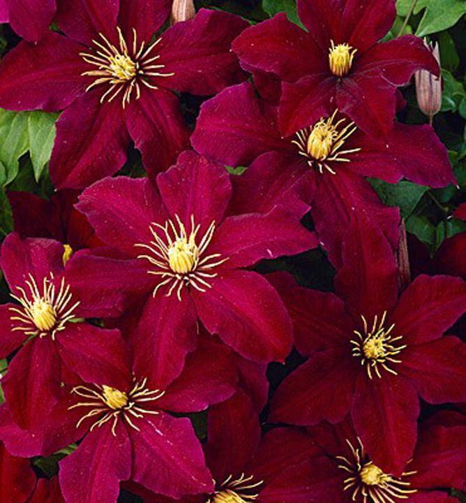 Eigenschaften: Die einzigartige Clematis 'NIOBE' trägt zahlreiche satte, samtige Blüten in charakteristischem Rot mit Burgunder-Tönen. Die Blütenmitte ist mit gelben Staubgefäßen versehen. Die Blüte erfolgt in zwei Wellen: von Juli bis August und erneut von Spätsommer bis Herbstbeginn. Die dreilappigen Blätter sind grün und fallen im Winter ab. Die Pflanze eignet sich ideal für den Anbau in Kübeln und erreicht eine Höhe von 2–3 m sowie eine Breite von etwa 1 m.