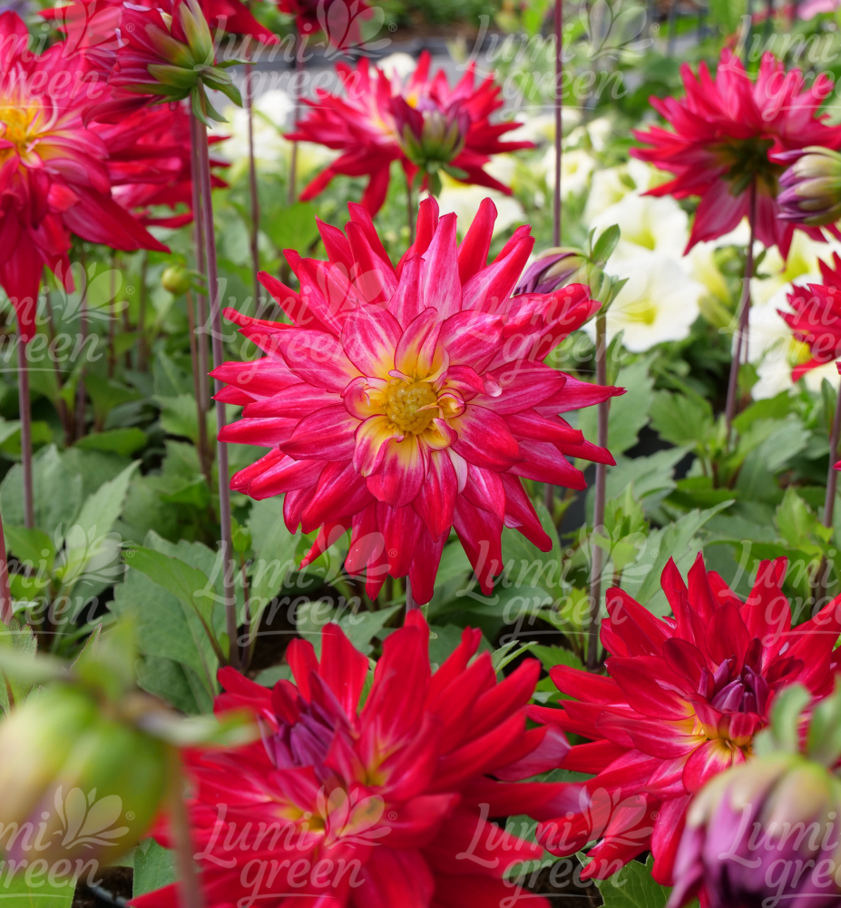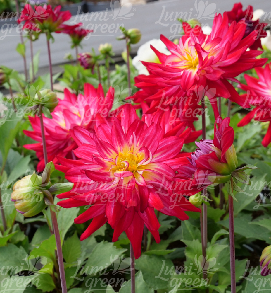 Eigenschaften: Die Dahlie ´RASPBERRY ICE´ ist eine Sorte mit sehr großen, gefüllten Blüten in intensivem Himbeerrot. Sie blüht von Sommer bis zum ersten Frost, die Blüten stehen auf kurzen, stabilen Stielen. Die Pflanze erreicht eine Höhe von etwa 40 cm, wodurch sie ideal für die Kultivierung in Kübeln, aber auch in Beeten, als Einzelpflanze oder in Gruppenpflanzungen geeignet ist. Die Blätter sind dunkelgrün, leicht glänzend, gefiedert mit gezackten Rändern, was der Pflanze ein üppiges und dekoratives Aussehen verleiht.