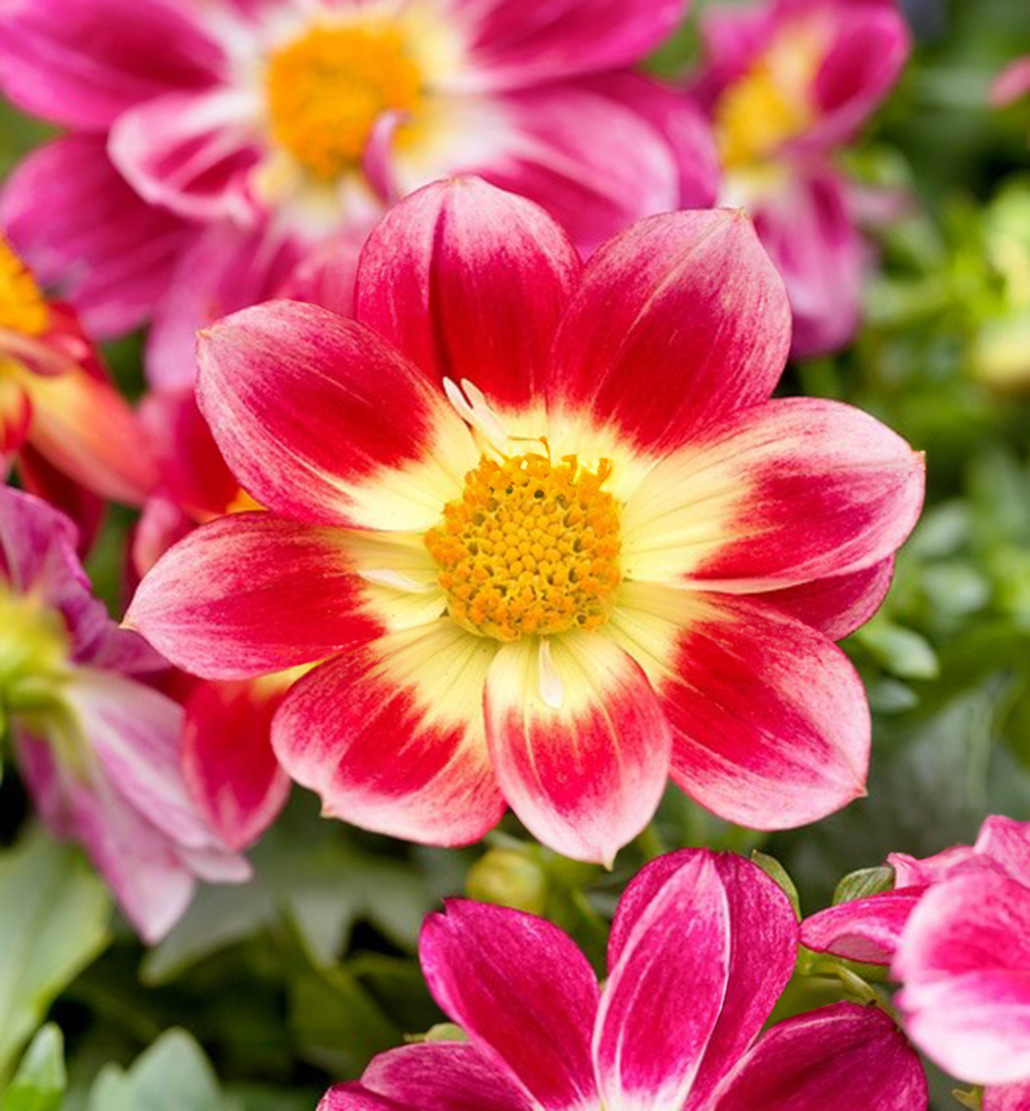 Eigenschaften: Die Dahlie ´SUMMER BREEZE RED BICOLOUR´ ist eine kompakte Sorte, die mit ihren großen, zweifarbigen Blüten in leuchtendem Kirschrot mit zarten gelben Nuancen den Garten verschönert. Sie blüht vom Frühsommer bis zum ersten Frost und lockt Bienen und Schmetterlinge an. Die Blätter sind dunkelgrün, fest, glänzend und gesägt. Die Pflanze erreicht eine Höhe von 60–90 cm und eignet sich ideal für mittlere und hintere Beete. Die Blüten sind auch als Schnittblumen geeignet.