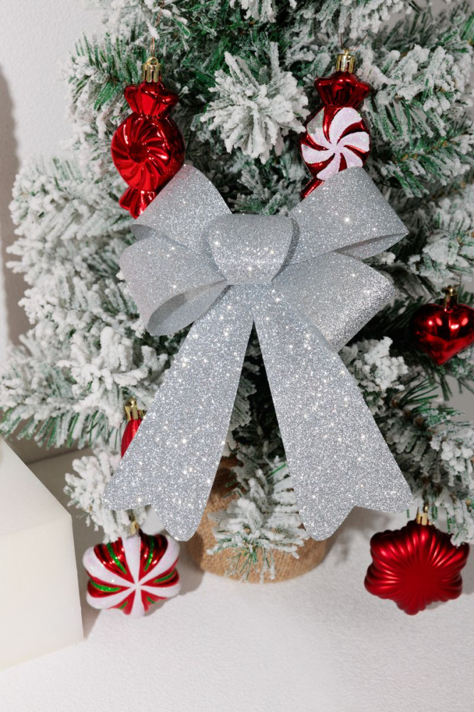 Eigenschaften: Diese glitzernde Weihnachtsschleife verleiht Ihrem Zuhause eine zauberhafte Weihnachtsatmosphäre. Sie eignet sich als Baumschmuck, für Weihnachtsgestecke und Adventskränze. Farbe: Silber. Größe: 13 x 21 cm.