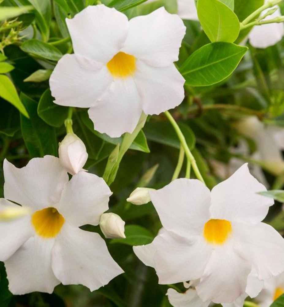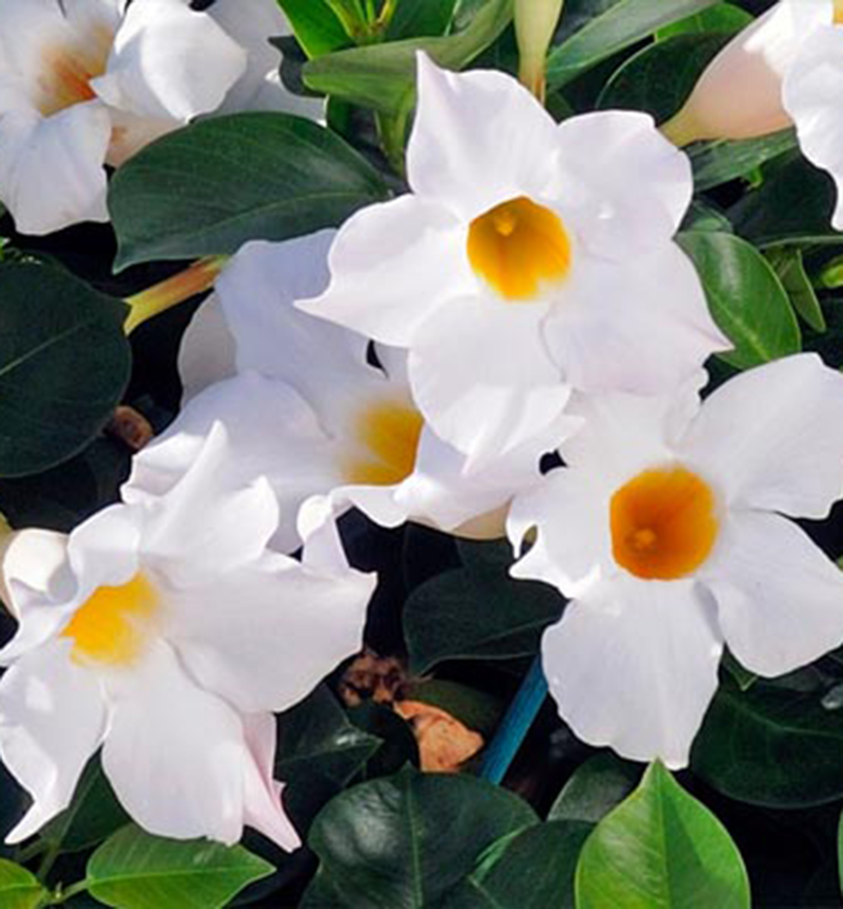 Eigenschaften:Die Sorte 'JADE WHITE' bezaubert mit ihren schneeweißen Blüten und der gelben Mitte. Die dunkelgrünen und sehr holzigen Blätter bilden einen interessanten Kontrast zu den Blüten. Die Pflanze bildet einen dichten, gut gebauten Horst. Mandevilla, auch als Dipladenia bekannt, ist eine beliebte Kletterpflanze, die die ganze Saison über unübersehbar aussieht. Die JADE-Serie wurde in Frankreich gezüchtet. Wir züchten es auf Balkonen, Terrassen oder in Töpfen.