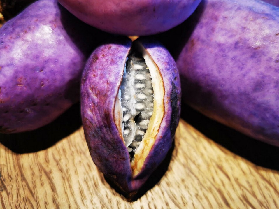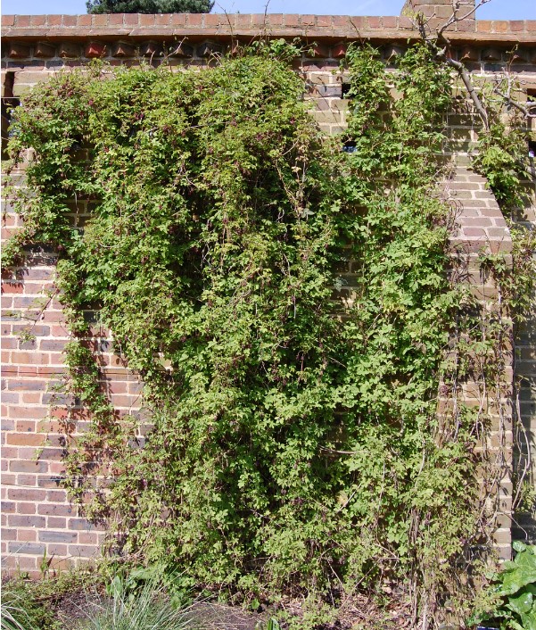 Eine robuste Kletterpflanze mit dreiteiligen Blättern und großen, länglichen, essbaren Früchten.