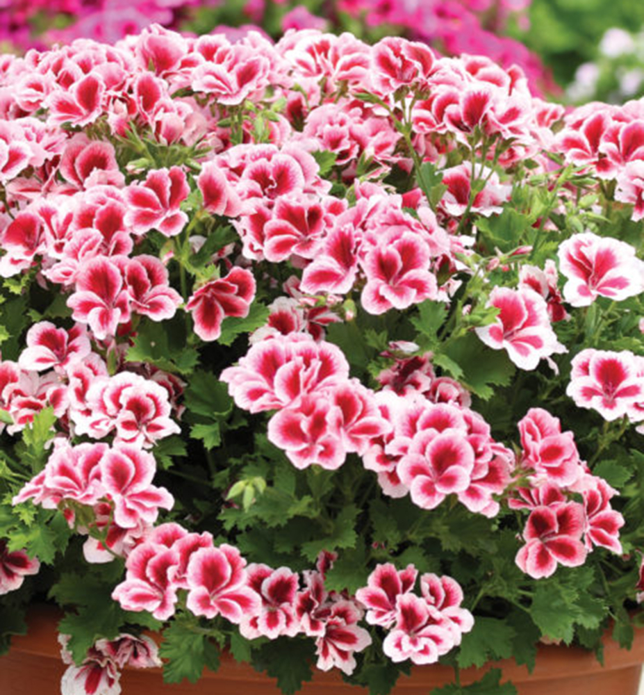 Eigenschaften: Die zweifarbigen, burgunderfarbenen Blüten mit hellrosa Rand machen die Edelgeranie ´ARISTO® STRAWBERRY CREAM´ zu einer auffälligen Dekoration für Balkone sowie für sommerliche Bepflanzungen von Fenstern und Terrassen. Sie beginnt sehr früh zu blühen.