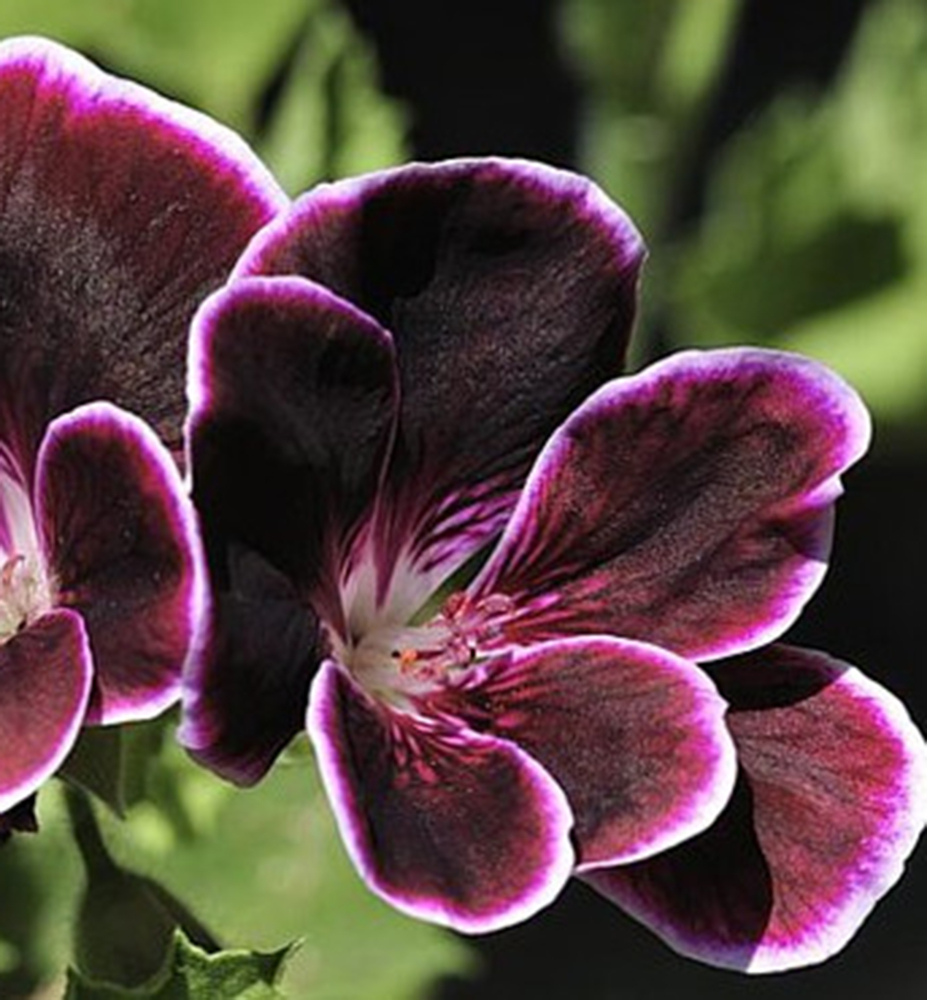 Exklusive Geranie mit dunklen, samtigen Blüten und elegantem weißen Rand.