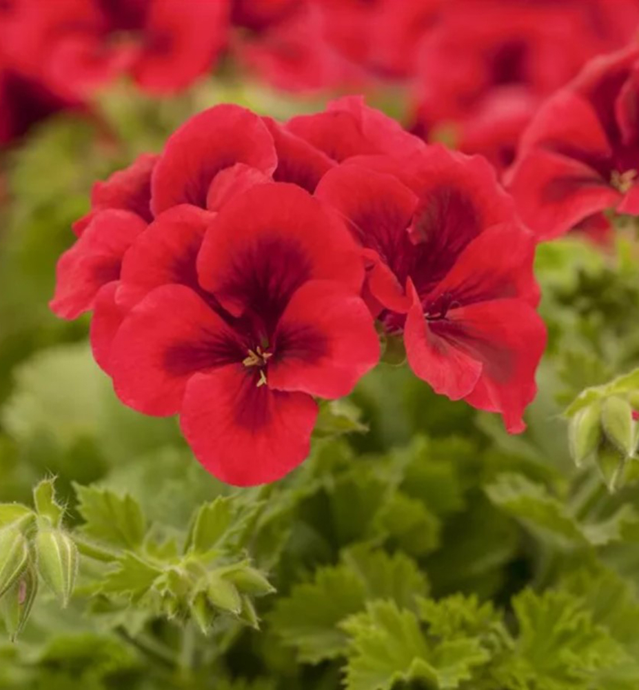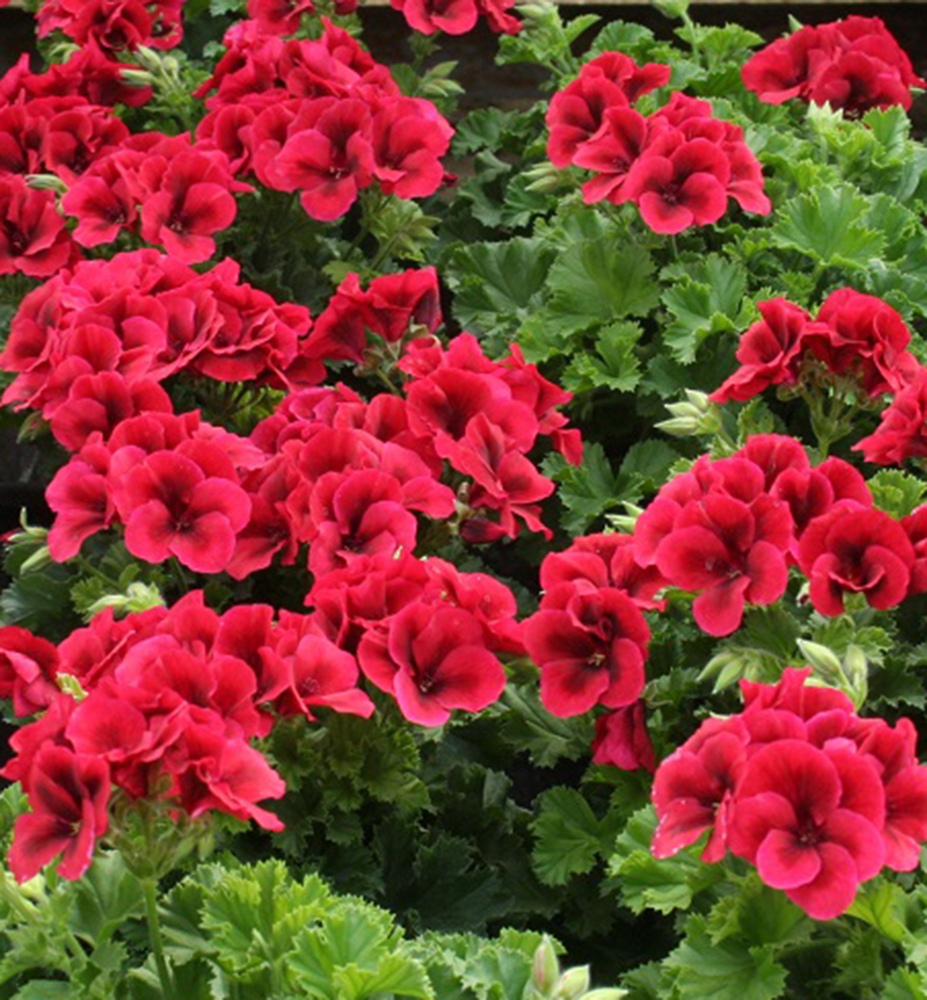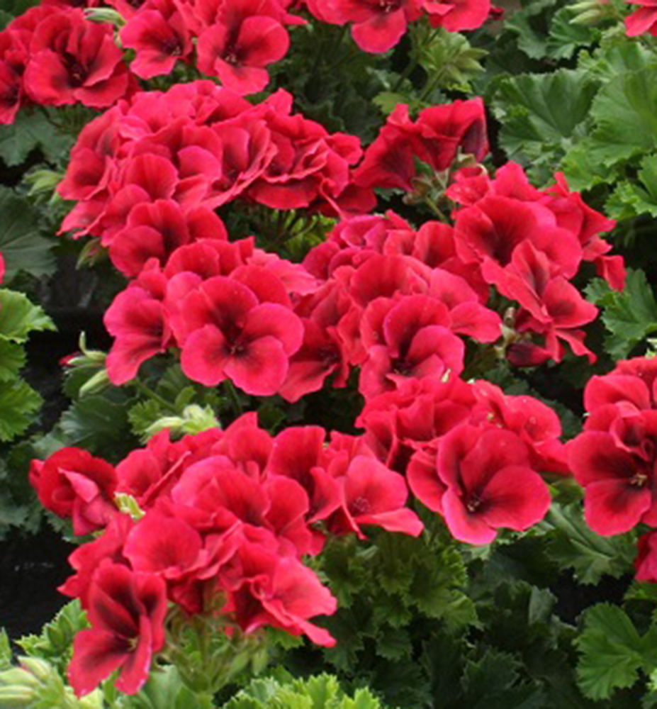 Eigenschaften: Die Edelgeranie ´ARISTO®BRIGHT RED´ bringt auffallend große Blüten in intensivem Rot mit dunkelrotem Auge hervor. Dank ihrer attraktiven Farbgebung eignet sie sich hervorragend zur Kombination mit helleren Sorten. Die ‘ARISTO®’-Geranien zeichnen sich durch eine üppige und gleichmäßige Blüte aus. Ihr Wuchs ist aufrecht. Die Blätter sind rund bis leicht gezackt und herzförmig, in verschiedenen Grüntönen.