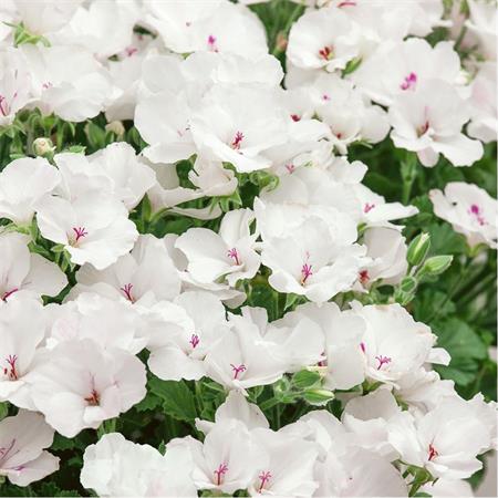 Zart wirkende, reich blühende Pelargonie mit großen weißen Blüten.