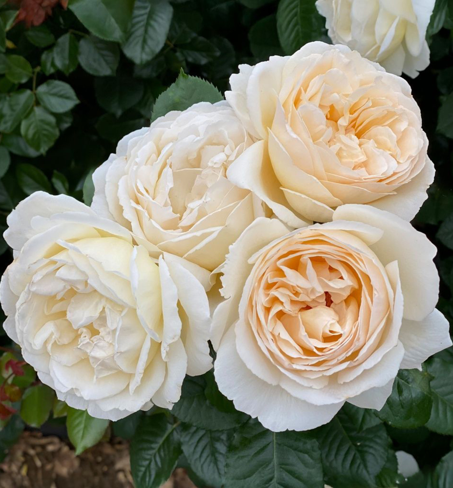 Eine elegante Rose mit großen, nostalgischen Blüten in zarten Marzipan-Creme-Tönen.