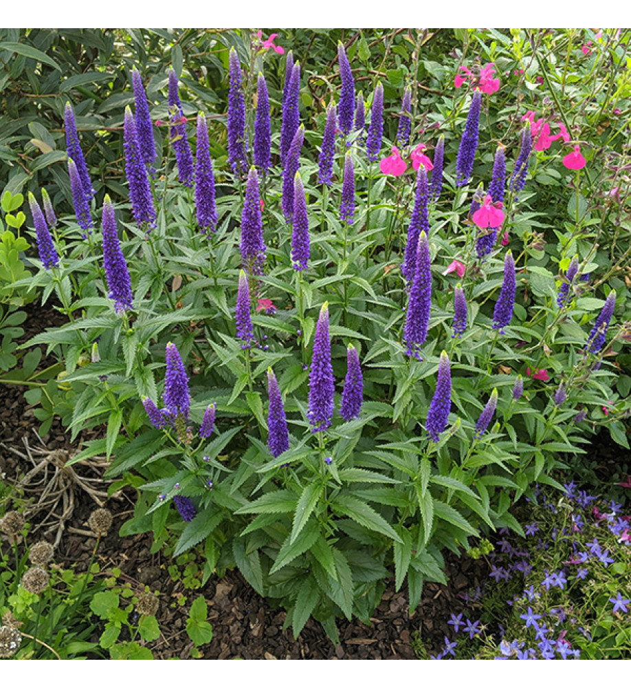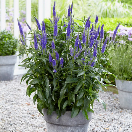 Eigenschaften: Der Ehrenpreis ´First Glory´ gehört zu den Stauden, die im Garten garantiert nicht unbemerkt bleiben. Auffällige, schmale Blütenähren in dunkelblauer Farbe blühen von Juni bis August und ziehen zahlreiche Bienen und Schmetterlinge an. Schön ergänzt werden sie durch lanzettliche, dunkelgrüne Blätter, die an grünen Stängeln in mehreren Etagen wachsen. Im Beet wirkt eine Kombination aus weißem, rosa und blauem Ehrenpreis besonders harmonisch.
