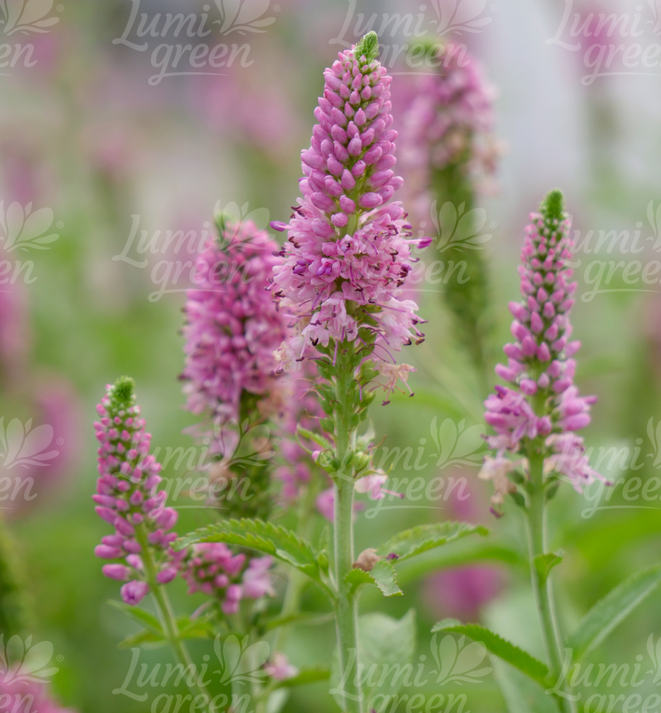 Eigenschaften: Der langblättrige Ehrenpreis „Erste Liebe“ ist eine schöne, üppig blühende Staude von kompakter Statur. Den ganzen Sommer über erscheinen markante, aufrechte rosa Blüten, die an den Spitzen leicht grünlich gefärbt sind. Aus den grünen Stängeln wachsen paarweise schmale, dunkelgrüne Blätter in mehreren Schichten. Blüten und Blätter erzeugen einen ansprechenden Farbkontrast.