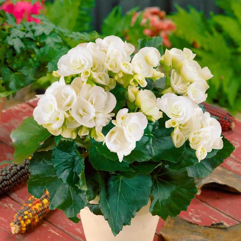 Wunderschöne aufrechte Begonie mit gefüllten weißen Blüten.