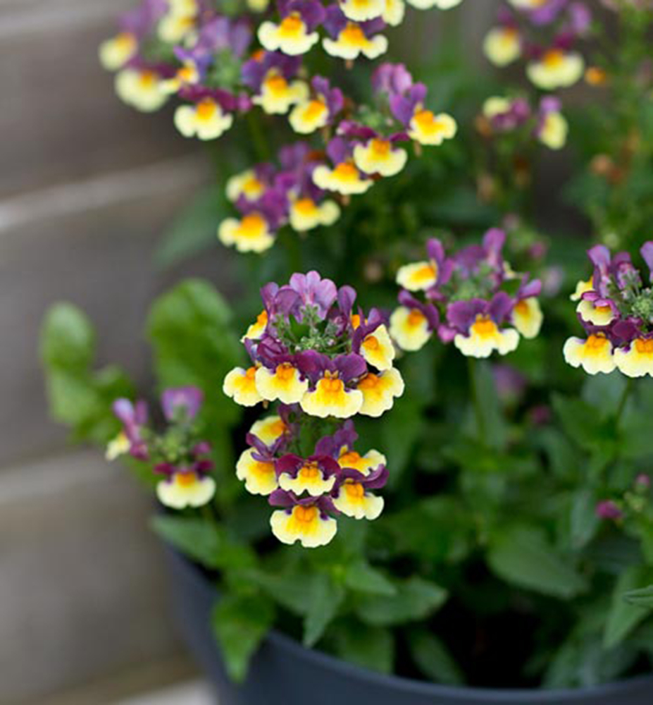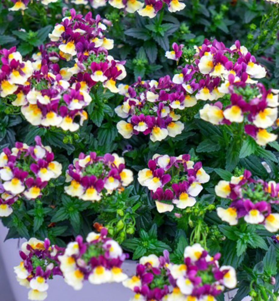 Eigenschaften: Der Elfenspiegel ´Escential Blueberry Custard´ bildet im Sommer prächtige, aromatisch duftende Blüten. Die unteren Blütenblätter sind leuchtend gelb gefärbt, die oberen violett. Auf den oberen violetten Blütenblättern bildet sich ein kontrastreiches gelbes Muster. Die Pflanze eignet sich sowohl für Kübel und Töpfe als auch für Beete.