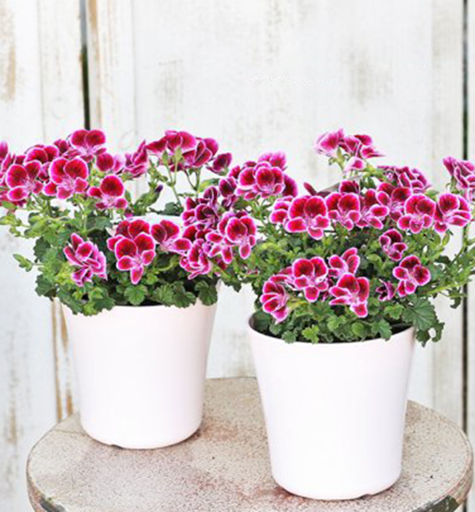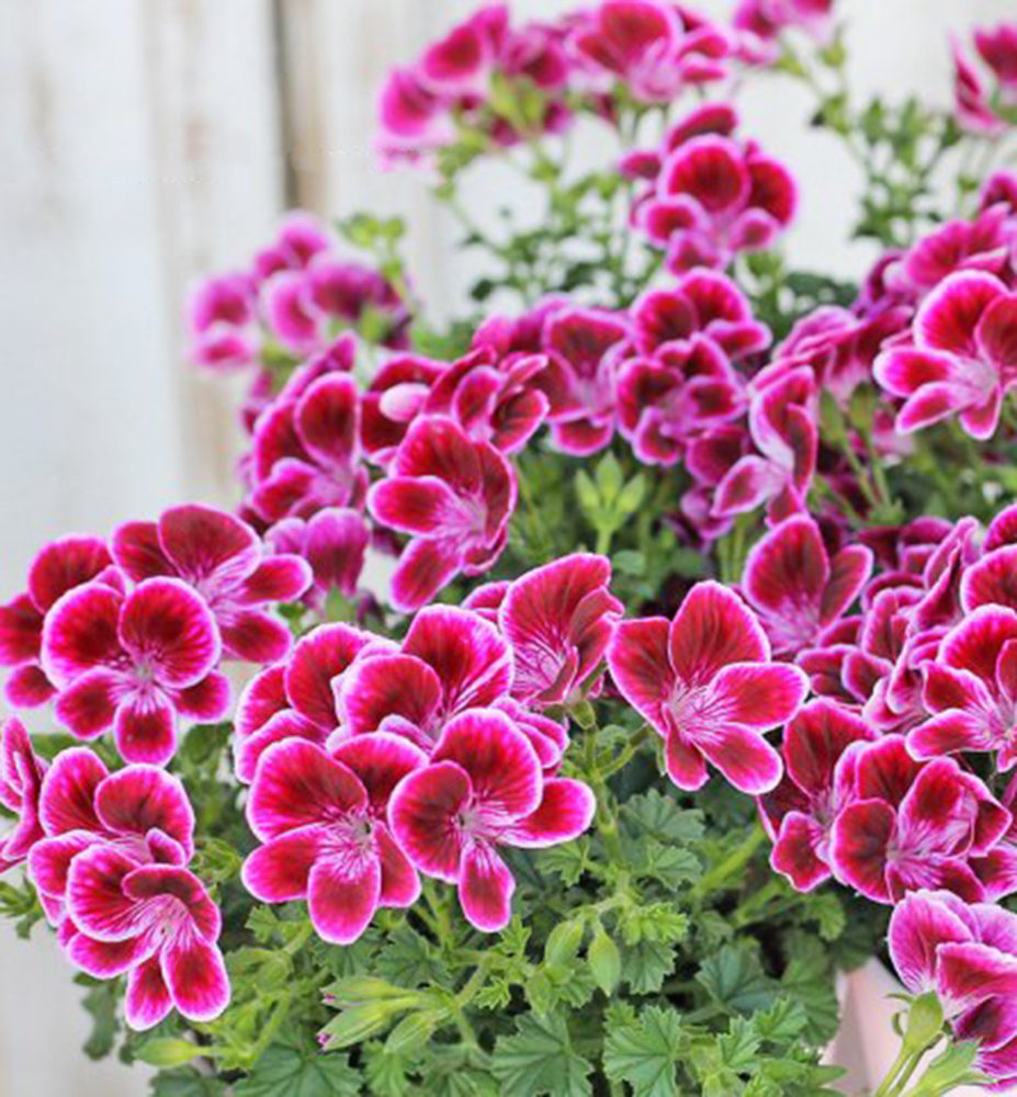 Üppige burgunderrote Blüten mit weißem Rand, ideal für Ampeln und Balkonkästen.