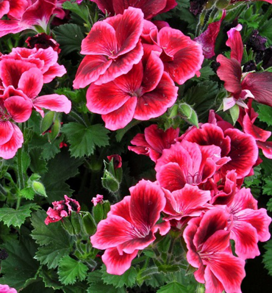 Eigenschaften: Die Englische Geranie 'ANGELEYES® CASSIS' bietet bereits ab April eine Fülle weinburgunderfarbener Blüten mit weißem Rand. Die leicht gewellten Blätter besitzen einen gezackten Rand und treten während der Blüte hinter dem üppigen Blütenflor nahezu zurück.