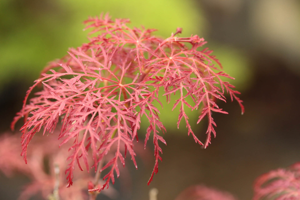 Eigenschaften: Der Fächerahorn ‘RED FEATHERS’ zeichnet sich durch tief eingeschnittene, sehr schmale Blätter aus, die der Pflanze eine feine, federartige Struktur verleihen. Im Frühjahr zeigen sich die Blätter in leuchtendem Rot bis Burgunderrot. Im Sommer verfärben sie sich – abhängig von Sonneneinstrahlung und Temperatur – zu einem dunkleren Burgunderrot bis rotgrün, bevor sie im Herbst erneut in intensiven Rot- bis Purpurtönen erstrahlen. Der Wuchs ist eher langsam und leicht überhängend, was der Sorte eine besonders elegante Erscheinung verleiht, insbesondere bei Hochstammveredelung. Sie eignet sich hervorragend für japanische Gärten, gemischte Pflanzungen sowie als Solitärgehölz im Garten oder in größeren Pflanzgefäßen.