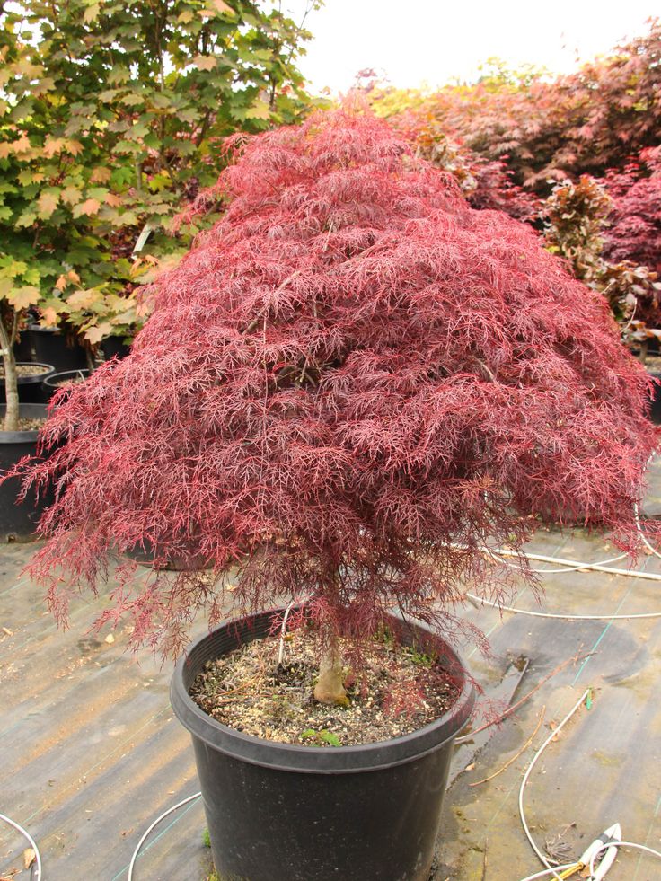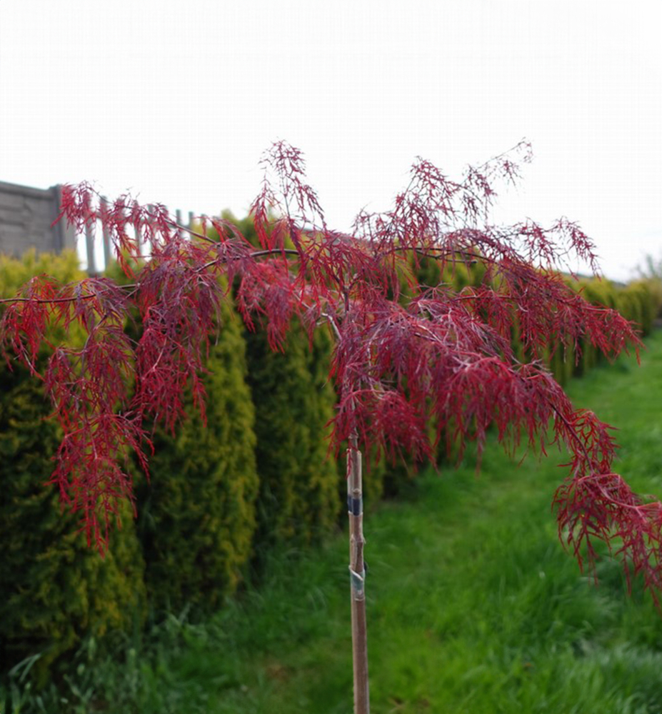 Ein auffälliger roter Fächerahorn, auf Stamm veredelt, mit schmalen, fedrig wirkenden Blättern.