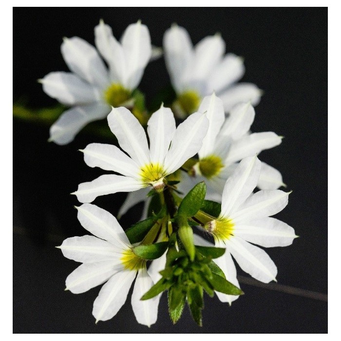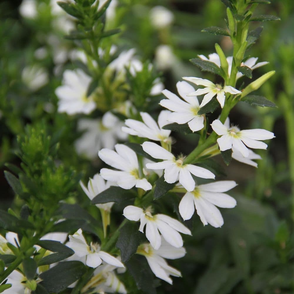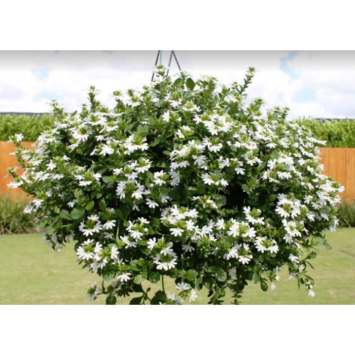 Eigenschaften:Fächerblume ´VENTIA WHITE´ blüht ab dem Frühjahr üppig mit weißen Blüten. Dank der fächerförmigen Form der Blüten erhielt dieses Jahr auch seinen Namen. Die Mitte der Blüte ist mit einem gelben Auge hervorgehoben. Diese Staude wird oft zusammen mit Geranien oder anderen Balkonpflanzen gepflanzt, wodurch interessante Kompositionen entstehen.