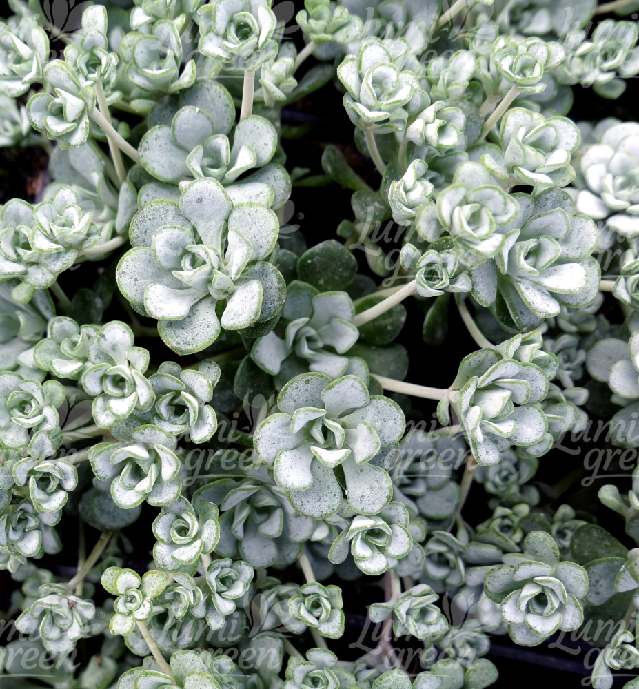 Eigenschaften: „Cape Blanco“ ist eine kompakt wachsende Sukkulente. Es hat bodendeckende Eigenschaften und bildet in kurzer Zeit einen dicken Teppich. Sie besticht besonders durch ihre silbrig-rosenförmigen Blätter, die sich bei direkter Sonneneinstrahlung violett verfärben. Im Sommer blüht es mit gelben Blüten, die Insekten anlocken.
