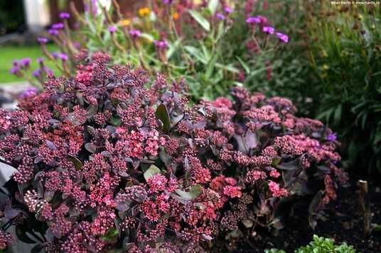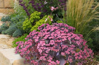Eine sehr schöne Fetthenne mit dunklen Blättern und rosa Blüten.