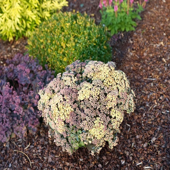 Eigenschaften: Fetthenne ´GLOBE YELLOW´ ist eine neue attraktive Sorte mit fleischigen Blättern von dunkler violett-violetter bis grau-violetter Farbe. Sie bildet einen aufrechten, dichten Haufen, der eine Höhe von 25–30 cm erreicht. Ab Juli entwickeln sich aus den rosafarbenen Knospen cremegelbe Blüten, die eine große Anziehungskraft für Insekten darstellen. Wir pflanzen sie in gemischte Staudenbeete, auch in Töpfen sieht sie sehr dekorativ aus. Es lässt sich gut mit Ziergräsern, Astern und auch grünen Fetthennesorten kombinieren.