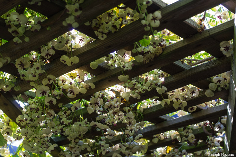 Eine Kletterpflanze mit duftenden Blüten in ungewöhnlicher cremefarbener bis gelber Farbe und essbaren Früchten.