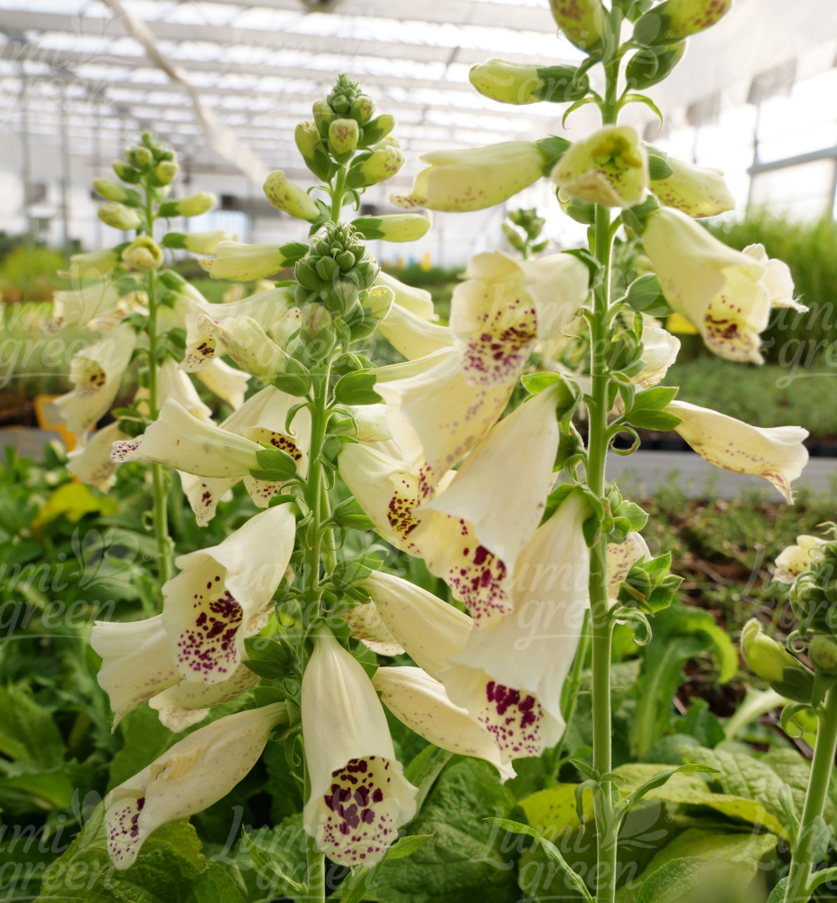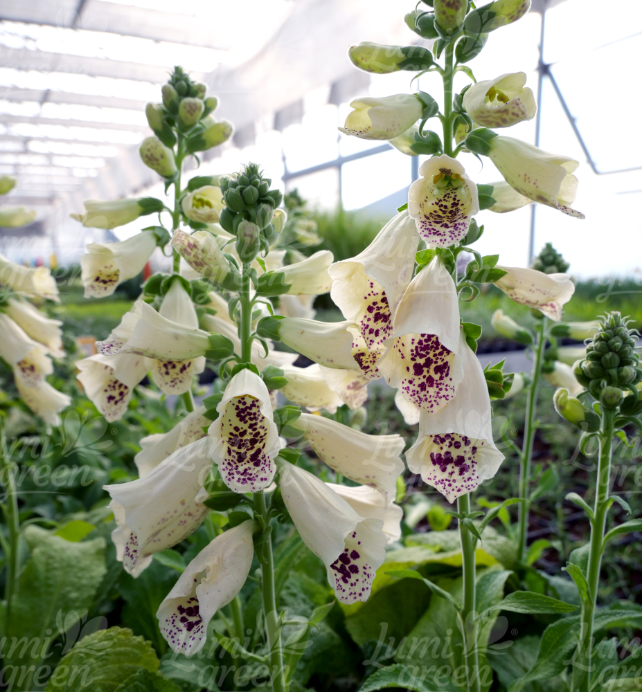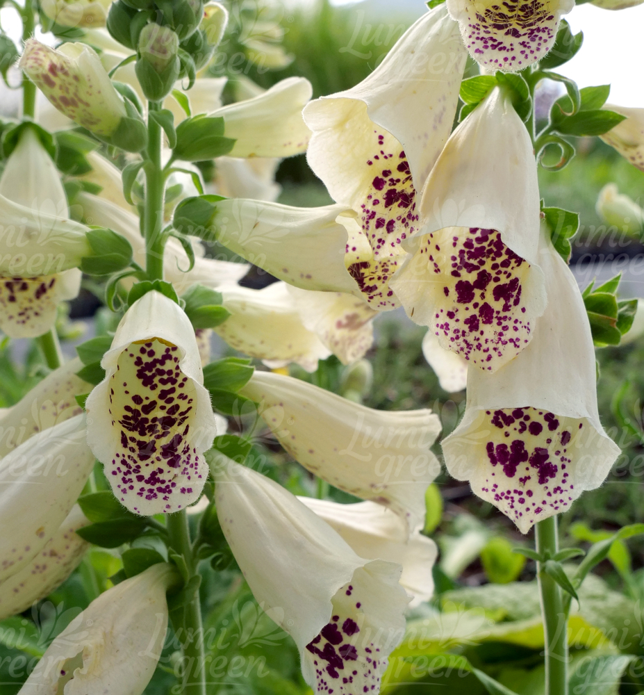 Eigenschaften: Fingerhut ´DOTTIE CREAM´ ist eine außergewöhnliche Sommerstaude, die durch ihre reich blühenden Blütenstände auffällt. Die cremeweißen trompetenförmigen Blüten sind innen mit markanten violett-rosa Punkten verziert. Aus einer Grundrosette wachsen breite Blätter. Sie erreicht eine Höhe von 50–60 cm und eignet sich daher für die Bepflanzung im mittleren und hinteren Teil des Blumenbeets.